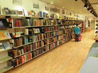 fra indgang til venstre side er der grønlandske bøger, første række er faglitteratut dernæst skønlitteratur